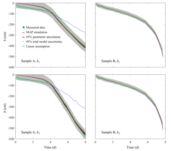 To check the performances of the different methods, the estimated parameters were introduced into the forward modeling to reproduce changes in the pressure head at the lower (h1) and upper (h2) observation points. The results are shown in Figure 10, where the differences between the linear assumption and the inversion were significant for sample A and relatively insignificant for sample B. The linear assumption yielded simulated pressure heads for sample A that agreed well with observations when the evaporation time was less than about 4 days. However, it significantly underestimated the decay rate of the stage 2 evaporation. The observation data points of sample A fell into the range determined from the 95% total model uncertainties of the SO inversion, but the MAP values of the parameters underestimated the pressure head when the evaporation time was less than about 4 days. In comparison with the traditional SEM based on the linear assumption, the inverse method could be more successful in capturing the whole evaporation process of soils when both stage 1 and stage 2 evaporation were involved. The linear assumption could be more reliable for the wet condition in the stage 1 evaporation but was not always useable for a relatively dry condition, such as that in the stage 2 evaporation. Such behavior was also reported by Dettmann et al. and Iden et al. [19,53], who proposed that the fitted parameters from the linear assumption need to be evaluated when they are used in the full measured pressure head range. Our study suggested that the SO inversion was an efficient alternative method for assessing the parameters of soils from the simplified evaporation experiment.