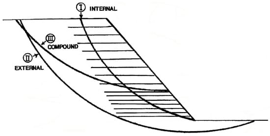 As Rowe and Soderman [18] stated, geosynthetics can fail by two mechanisms, either on the soil-reinforcement interface, or internally as the rupture of the reinforcement element itself. To resist the tensile rupture of the element, the resistance is straightforwardly calculated by using the material’s parameters and the cross section. To resist pull out, multiple effects are in place, whose relative contribution to the total pull-out resistance effect has been studied by various authors [24,27,28]. When such elements are placed within a levee, a few failure modes can be expected, namely internal, external, and compound [29], as shown in Figure 1. Internal stability refers to slip surfaces which pass entirely through the reinforcement layers, which means that the reinforcement failed either by tensile rupture, or by pull out. External failure refers to deeper slip surfaces which go around all the reinforcement layers. The compound failure is the most common type, where the slip surface goes around and through various reinforcement layers. On top of those mentioned failure modes, if the spacing between neighbouring reinforcement layers is too big and secondary reinforcement is not provided, failure can initiate by soil sliding between those layers, which then leads to a global failure. Thus, geogrid reinforced slope sections usually consist of primary or principal, and secondary or intermediate, geogrid layers [2,29,30,31]. Failure of the slope can also occur without the need of reinforcement failure, i.e., if the reinforcement is a low stiffness geosynthetic whose failure strain is much larger than the strain at which the slope fails, then the whole slope might fail without reaching any of the previously defined geosynthetic failure mechanisms [18]. Which failure mechanism will occur in a levee highly depends on the cross section of the levee and whether it is a newly constructed levee or a reconstructed one, because these parameters will dictate the placement of geogrids.