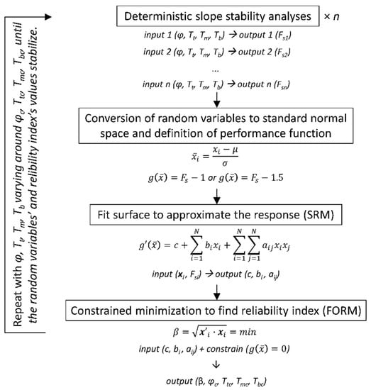 The result is, (1) the reliability index β defined as the shortest value of the radius vector xi which defines the limit state function, and (2) the standard normal variables’ values xi which give the previously defined distance. After a few iterations, these values converge towards the true limit state function. When the difference between two iterations becomes negligible, the procedure stops. This is usually achieved within 2–4 iterations for this study. Each iteration contains new deterministic slope stability analyses with new random variables’ values, which resulted from previous iterations. To calculate the probability of failure from the resulting reliability index, the cumulative standard normal distribution is calculated for the reliability index with inversed sign. As the optimization needs a set of starting values, they are varied for the same calculation to check for the robustness of the result and for local minima. Another quality check is made by plotting surfaces in a 3-dimensional space by ignoring 2 of the random variables. To accept the result, not only is a small change in consecutive iterations needed, but also the quality of regression between the real performance function and the approximated one, as shown in Equation (6) [56], needs to be ≥0.95.