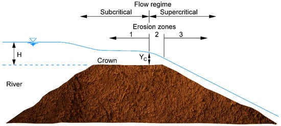 where g (m/s2) is the gravitational acceleration and h1 (m) is the upstream head (elevation over the levee crown). If a steady flow is assumed, the discharge is constant along the slope. Therefore, the height of water perpendicular to the slope in the steady, uniform flow area for unit length of the levee can be calculated from Equations (8) and (9) as: