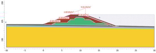 where γw (kN/m3) is the unit weight of water. Equation (11) conservatively overestimates results, since the resulting pressure is a little bit higher than the pressure in area above the steady flow [60]. Shear stresses calculated this way are applied along the crown and landside slope, as shown in Figure 4 for the case study numerical model.