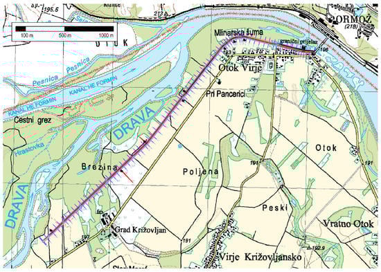 In 2012, a water level of 1000-year return period was measured in the Drava River, which caused the overflow of the embankment over a length of more than 1 km, and breaching over a length of 50 m, causing huge damages to the surrounding area. Since the original embankment was built in 1968 with the design high water level from 1965 [66], a reconstruction of the existing embankment is required for raising its crown height to new design water levels. The new required height corresponds to the new 100-year return period water level +1 m, which is between a few cm and 1 m above the old crown. Raising the height also implies a widening of the embankment cross section, which can be accomplished in three ways: by keeping the existing embankment on the landward side of the new one (i.e., reconstructing towards the river side), keeping the existing embankment on the river side (i.e., reconstructing towards the landward side), and by coinciding the existing and new axes (i.e., reconstructing on both sides). The selected reach for this case study is defined by the reconstruction direction and subsoil stratigraphy—the reconstruction on both sides is chosen. A situational view of the embankment section on the Drava River is shown in Figure 5.