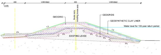 The reconstruction of the levee is made with well graded gravel (GW by USCS classification). Since gravel is highly permeable, GCL membranes are used to make sure the free water surface stays inside the levee body during high water events. Suzuki et al. [67] performed field and laboratory tests with various types of GLC to find their effect on the stability of the embankments. However, since the GCL in this study is located on the riverside of the levee, while the stability of the landside is analysed, their effect is not relevant for this study. Other than that, the body is further strengthened using TENAX TT 045 GS, HDPE uniaxial geogrids. The embankment’s cross section used in calculations is shown in Figure 6. Geogrids are placed on 0.7 and 0.9 m distance from one another to fit the height of the embankment, while the maximum suggested height for reinforced slopes as per [31] is 1 m due to local face stability. This way, local face instabilities are partly mitigated. Instabilities on the landside may also be initiated by surface erosion during overflow. The resistance against such action can be increased by placing a reinforcing layer of standard geosynthetics or other specific products [68] such as biopolymers [69,70] over the slope, but in this case, there is no such additional protection. The same applies for the riverside slope where surface erosion might be caused by the flow of the river and during the rapid decrease of water level in the river (RDD).