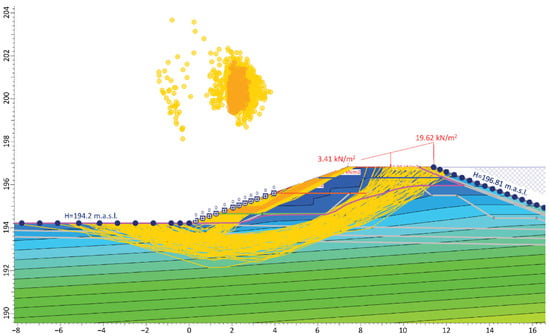 Stability analyses aim to find the critical slip surface by using a population-based stochastic algorithm, Cuckoo Search, which searches for non-circular slip surfaces, together with Monte Carlo optimization to potentially find even more critical surfaces [64]. All the slope stability analyses are deterministic with values of the four random variables previously described varied over appropriate ranges, while probabilistic analyses are conducted after the results of deterministic analyses are obtained. The variation is manually performed for the friction angle, while for the geogrids it is performed with the help of Latin Hypercube simulations. It was initially conducted over a range of ±3σ with steps of 1σ to detect the approximate location of the design point and was then corrected to smaller steps closely spaced around the design point.
