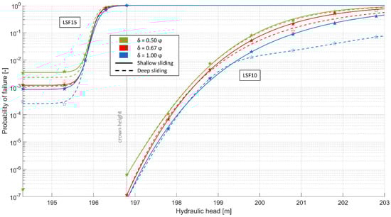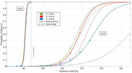 where pf,min and pf,max are minimum and maximum values of the function respectively, the mean hydraulic head, and k is the slope of the curve at the mean value. The curve is fitted to the points using least-squares. By using such a function, a curve can be defined even by not having the whole range of points from zero to one probability of failure. As can be seen from the figures, for the cases where the limit state function is defined by FS = 1.5 (LSF15), the probabilities of failure occur over the whole range, and certain limit-state-behaviour with probability of one is already reached at the crown water level. For the limit state function defined by FS = 1 (LSF10), the maximum calculated probabilities of failures reach from around 65% to as low as 10%, while the rest of the curve is based just on the fitting to those smaller values.