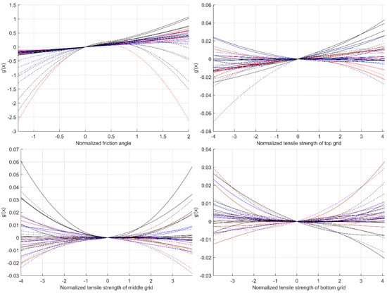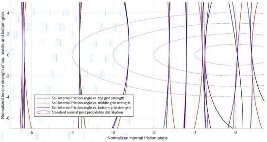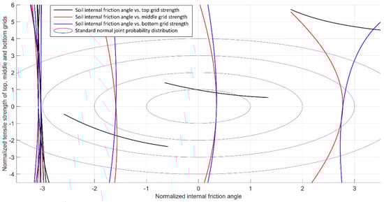 While interpreting the results of computed conditional probabilities of failure, it must be kept in mind that they are calculated based on only one point closest to the origin, defined by the reliability index. This implies the linearization of the limit state function for integration below the standard normal joint distribution, which can lead to an overestimation or underestimation of the real probability, depending on the true shape of the limit state function [52]. To investigate their shapes, 2D representations of the limit state functions for mean interface friction, and for LSF10 and LSF15, are shown in Figure 10, where the black lines represent LSFs for soil internal friction and top grid strength as random variables, red lines LSFs for soil internal friction and middle grid strength as random variables, and blue lines LSFs for soil internal friction and bottom grid strength as random variables. The rightmost curves correspond to higher water levels, decreasing towards the leftmost curves. The circles in Figure 10 represent the standard normal joint distribution, i.e., each circle corresponds to one standard deviation. From the figures it can be seen that LSFs are slightly curved in either direction, without any notable trend, thus giving mixed results in terms of conservativeness. However, the effect of linearization is not expected to be high in most cases due to the curvatures being relatively mild. Similar shapes are noted for all interface friction angle values and are not shown here.