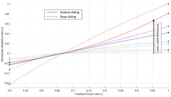 - The increase of reliability with increase in interface friction ratio is approximately linear in proximity of the ultimate limit state, with higher steepness for higher water levels. Also, deep surfaces seem to have a steeper curve than shallow surfaces. This is not true farther away from the ULS.