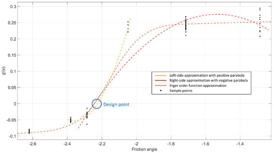To analyse the sensitivity of the slope stability to each of the defined random variables, 2D sections of the response surfaces through the design point are plotted on Figure 12. For each graph, one variable of interest is varied in the vicinity of the design point, while the other random variables are held at their respective design point values. The horizontal axes on the graphs are normalized such that the design point value is at zero and show the number of standard deviations away from the point. In other words, the curves are shifted from values obtained through Equation (1) to align all the design points at zero. This helps comparing the trends of the response surface at various water levels. From the response surfaces, it is found that two main trends exist, namely parabolic (positive or negative) and linear. This is of course constrained by the function used to approximate the response surface (Equation (4)), which is a quadratic polynomial. It is intuitive that the increase of any strength or resistance parameter’s value causes the stability of a slope to increase by increasing the safety factor. However, some curves shown in Figure 12 seem to contradict this statement as they are parabolas which have maxima and minima at, or close to, the design point. This is just an apparent problem caused only by the chosen approximation function and does not show any inconsistencies considering the friction angle because all the maxima are found on the right side of the design point, while all the minima are found on the left side, and the curves are fitted to the data by their increasing parts. This mostly occurred when smaller friction angles did not have a distinction between deep and shallow sliding, but higher friction angles did have it. In those cases, a sudden increase in safety factor occurs and a parabolic response surface cannot be generated with the whole range of data for deep sliding. This means that to achieve a good fit of the data to a parabola, one needs to discard all but the closest sample points on either side of the design point, while only keeping all the points on the opposite side. An example of such situation is shown in Figure 13. It is obvious that a higher order function should be used to approximate such data. It could be argued that if only a narrow range of data around the design point is used, then there would be no need to approximate the data using higher order function. While this may be true in some cases, in other cases the range which would be needed to avoid higher order functions is relatively narrow, and would complicate the analysis to find values only inside that narrow range.