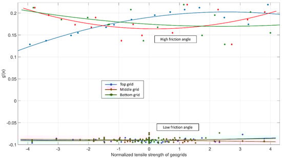 For the geogrids’ tensile strengths, the trends are generally constant, which means they do not affect the safety factor. However, there are multiple increasing curves, and others which actually do show a decrease of the safety factor with a strength increase. Regarding the latter, it should be noted that the range of safety factors on Figure 12 for the grids is from 0.95 to 1.05, and thus such trends cannot be deemed as true trends. They can instead be attributed to data scatter in both deep and shallow surfaces, as well as to the shape limitations of the selected approximation function. This data scatter occurs mostly for the bottom and middle grid layers, and only at the higher end of friction angles. In the same region of friction angles, the top grid’s strength start showing a linear to parabolic trend, as shown in Figure 14. This kind of data, however, also did not cause any inconsistencies with results, as the design point tensile strengths are practically at the mean values for most cases (Figure 15).