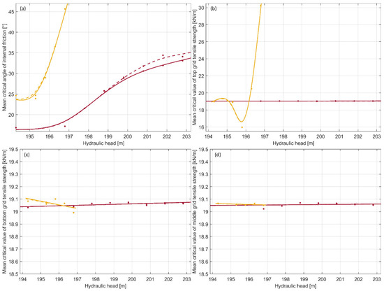 With each increment in water level there is change in probability of failure/reliability index, which is caused by the different critical values of random variables needed to reach a specific LSF at that specific water level. Even though the critical values differ when the same water level is evaluated with different interface friction ratios, because the difference is not large, Figure 15 shows the mean critical value of each random variable. Figure 15 is a representation of Equation (5), where the total reliability index can also be calculated for each water level by knowing the corresponding critical values of each random variable. Even though Figure 15b shows a decrease in critical tensile strength for the LSF15 at hydraulic head near 196 m.a.s.l. compared to lower heads, the reliability index still decreases (Figure 8 and Figure 9) due to an increase in critical friction angle. On the other hand, the critical value for the LSF10 shows practically no change with the increase of water level. This is also true for both LSFs for the middle and bottom grids.