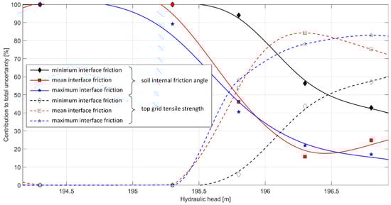 To investigate the relative contribution of the uncertainty of each random variable to the total uncertainty, the direction cosines (or sensitivity factors) are calculated as the ratio of each random variable’s critical value to the reliability index. The squared sensitivity factors give us the values of interest [79]. For all interface friction angles (low, mean, high) for LSF10, the contribution of the internal friction angle is >99.84%, with a mean value of 99.97%. The small remainder (<0.15% of total uncertainty) belongs to all three layers of geogrids, with almost 3/4 of that belonging to the top grid, and the rest somewhat evenly distributed between the middle and bottom grids. For LSF15, the relative contribution of the internal friction angle decreases with the increase of water level, from almost 100% to 17%, while the rest is attributed to the top grid, as shown in Figure 16. The middle and bottom grid’s contribution stayed close to zero at all times.