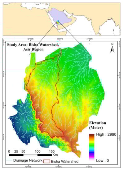 The Bisha watershed, with an area of 21,260 km2, is located in Saudi Arabia’s south-western region and shares a border with Yemen. The Bisha watershed boundaries are found north of the equator, between 17°59′27.588″ N and 20°49′13.958″ N, and east of the Greenwich meridian, between 41°49′50.825″ E and 43°11′20.254″ E (Figure 1). It has a diverse landscape, with highlands, high mountains (between 2000 and 3000 m MSL), plateaus, and Wadiyan. It also includes a large area of the desert to the north and east, stretching all the way to Bisha and Tathlith. The elevation varies between 950 and 2980 m, with a mean of 1655 m. As per the geological settings [79], it is made up of Jurassic–Cretaceous sedimentary rocks (limestone, sandstone, and shale) and Precambrian granite igneous rocks. The region’s climate varies significantly according to geography and season.