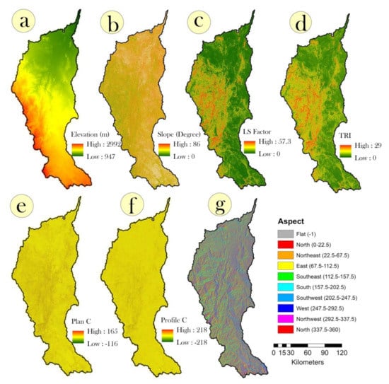 DEM derived topographic parameters, such as (a) elevation, (b) slope, (c) LS Factor, (d) TRI, (e) plan curvature, (f) profile curvature, and (g) aspect.