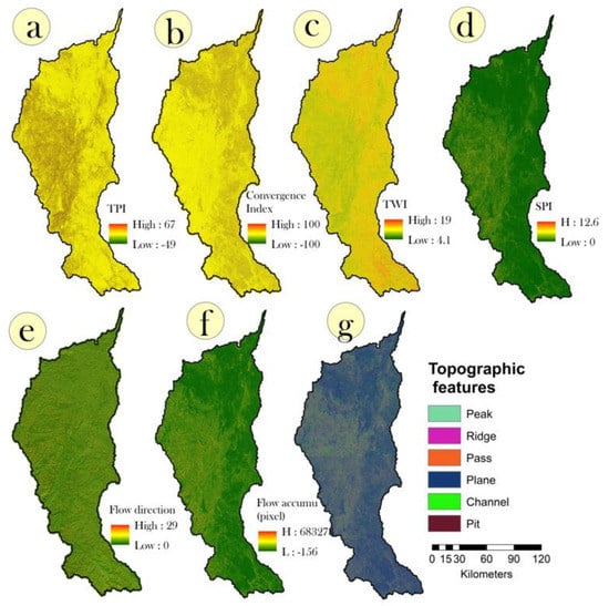 DEM derived topographic and hydrologic parameters, such as (a) TPI, (b) convergence index, (c) TWI, (d) SPI, (e) flow direction, (f) flow accumulation, and (g) topographic features.
