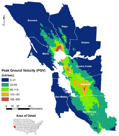 Hazard intensity is based on the simulated ground-motion PGV data from the HayWired scenario [19]. Porter [1] applies the break/leak ratio, identified by Ballantyne et al. [25], which found that pipeline damage from earthquake-induced ground-failure in several earthquakes resulted in a 50/50 percent break/leak ratio. In the absence of ground failure, the ratio was 15/85 percent breaks versus leaks. Liquefaction susceptibility in the San Francisco Bay Area [26] is used to estimate liquefaction probability [27], which is an extension of methods presented in Holzer et al. [28,29] for Santa Clara [28] and Alameda [29] Counties. Hazus loss estimation was used with liquefaction susceptibility maps [30] to estimate liquefaction probability in the rest of the study region [31]. Landslide probability [32] and fault rupture estimates [19] are from the HayWired scenario.