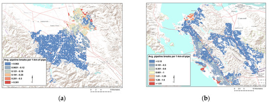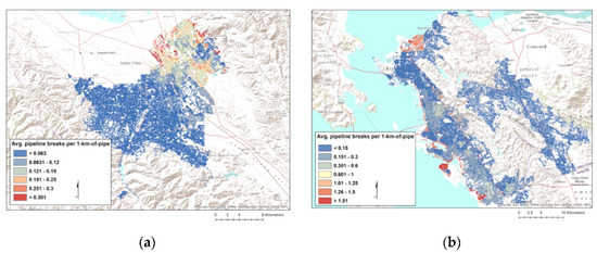 Average break rate per 1 km of pipe for the HayWired mainshock in: (a) SJWC and (b) EBMUD service areas.