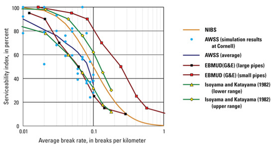 Markov et al. [36] proposed to measure serviceability using a serviceability index, defined by the ratio of total available flow to total required flow, which differs from the Isoyama and Katayama definition of serviceability. In the Hazus loss estimation [11], loss of serviceability is expressed as the percentage of “households without water” and is based on the Markov et al. [36] modeling of the EBMUD and San Francisco Auxiliary Water-Supply System and Isoyama and Katayama [35] modeling of Tokyo’s water-supply system. A simplified estimation of the potable water system network performance (i.e., number of households without water) uses the serviceability index, conditioned on the average water pipeline break rate per 1 km of pipe () within the user defined study region.