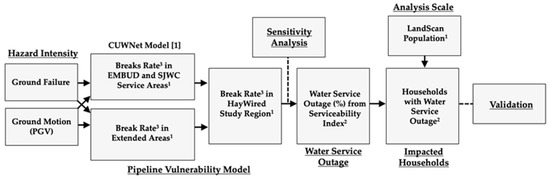 The applications of the model can be expanded to include estimates of emergency food as well as water resource requirements in an earthquake, similar to those identified in the Bay Area Earthquake Plan [47]. Damage to lifeline infrastructure systems such as electric power, gas and water pipelines, bridges, roads, and railways, all affect the availability of food and water in a disaster. The percent of households impacted by utility service outage and transportation disruption could be weighted by a measure of the socioeconomic and demographic characteristics that contribute to risk disparity for post-disaster food insecurity and resource access experienced by individual households [50]. These estimates could be used to rapidly allocate emergency food and water resources—in a broader conceptual modeling framework—that could include the results of the current study.