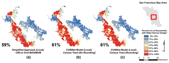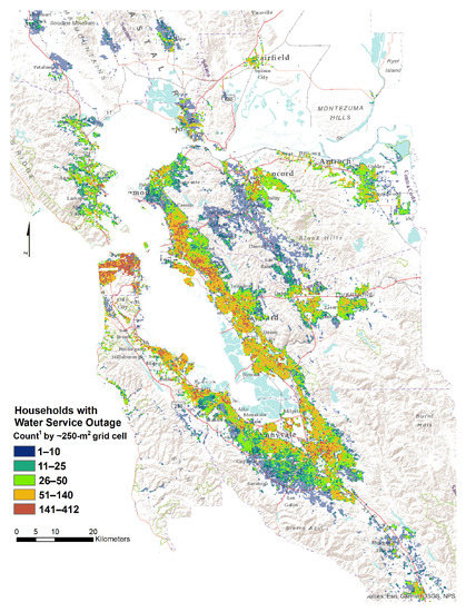 The simplified approach moderately increased estimates of households with water service outage in dense urban areas, exposed to high hazard intensities near the fault. In areas of Contra Costa County, the CUWNet model used a proportional estimate of liquefaction from Alameda County, while the simplified approach used the Hazus estimates of liquefaction probability in Contra Costa County [18]. This resulted in an underestimation of break rates by the CUWNet model in Porter [1] in these areas and accounts for most of the difference in comparison. Porter [1] also shows less pipeline inventory in many areas with high liquefaction hazard. The simplified approach may increase estimates in these areas. Ground-motion intensities change rapidly over smaller areas near the fault, and so inventory data used in calculating breaks in the CUWNet model for the average break rates per 1 km of pipe will provide a more accurate estimate in dense urban areas (Figure 10). The simplified approach may provide a reasonable estimate of households with water resource needs in areas near the fault, if detailed studies are unavailable. This conclusion is further discussed, in the following section, in comparison with other study results.