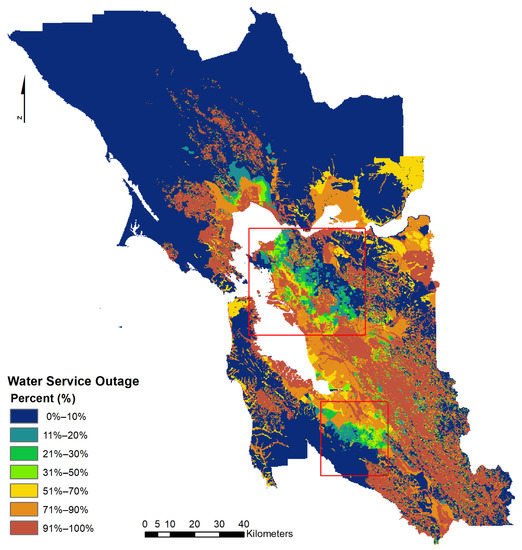 Potable water service outages are estimated. The default Hazus serviceability index (Equation (7)) used in the CUWNet model, is applied in the case study with μ = 0.1 and β = 0.85 based on the NIBS curve in Figure 3. In the case study, potable water service outages (percent) are calculated per ~90 m2 (three-arcsecond) grid cell centroid using the default Hazus serviceability index. The serviceability index result is taken to represent the average percent of households in each grid cell with full water services, as in the Hazus loss estimation methodology [11]. In a simplified, deterministic approach, the convex relationships between water pipeline damage and serviceability found in simulations of the hydraulic processes of the EBMUD water system [15] are modeled by the maximum (percent) service outage per ~250 m2 (nine-arcsecond) grid cell—which includes nine underlying ~90 m2 (three-arcsecond) raster grid cells, and their serviceability results.