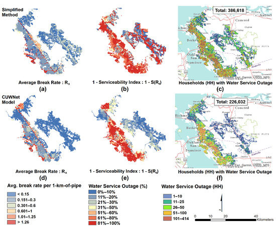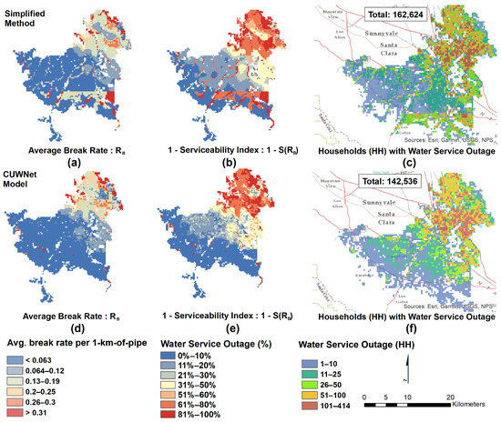 Comparison of simplified approach in SJWC service area with CUWNet model estimates: (a) Average break rates from simplified method; (b) water service outage (%) from simplified method; (c) water service outage (HH) from simplified method; (d) average break rates from CUWNet model [1] (e) water service outage (%) calculation from CUWNet model [1] break rates; (f) water service outage (HH) calculation from CUWNet model [1] break rates.