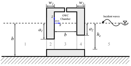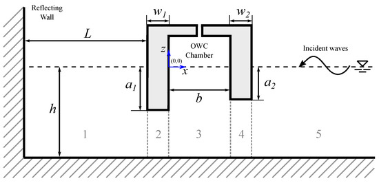 There is still a lot to be investigated regarding the improvement of the hydrodynamic efficiency of fixed-detached OWC devices by modifying the geometric parameters of the chamber. To the best of the authors’ knowledge, a theoretical study into the interaction of water waves with a fixed-detached OWC device with asymmetric thick rear and front walls, with a step and a reflecting wall, has not been reported. Apart from absorption of wave energy, fixed-detached OWC devices can be used to protect maritime structures and human activities from wave attack, as well as to enable water exchange and sediment transport [16]. They may, however, be affected by severe storms, which can cause serious structural damage, as was the case with the Mutriku Wave Energy Plant [32]. Therefore, the thickness of the back and front barriers that comprise the OWC chamber must be designed to withstand wave loads and save the structure, while the effect that this would have on the device performance must be also considered.