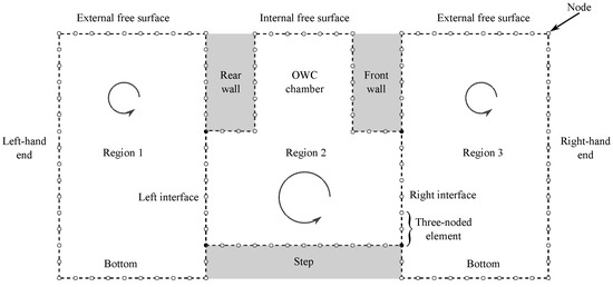 The radiation and scattering BVPs are divided into three regions, as shown in Figure 3, with common interfaces on both sides of Region 2. Since the far-field boundaries at must be placed far enough from the OWC chamber to avoid the effect of local disturbances, the domain as a whole becomes very long, and numerical problems associated with the integration of the fundamental solution over long distances arise [34]. The subdomain method is employed to overcome these numerical issues. This also helps to avoid numerical instabilities that appear when the wall thickness is very small [13].