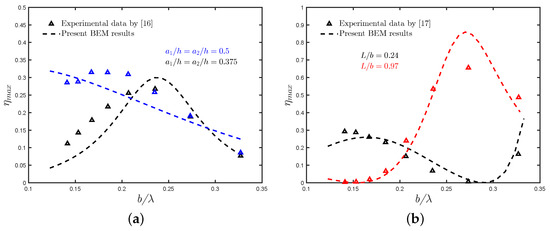 Comparison of the present results for the hydrodynamic efficiency with the experimental results obtained by (a) [16] for a pile-supported OWC device and (b) [17] for an OWC device near a reflecting vertical wall.