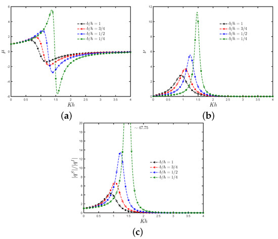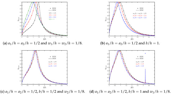 Figure 10a–c shows the analytical results for the radiation susceptance and radiation conductance coefficients, and , respectively, and the non-dimensional induced volume flux due to the scattering potential versus for different values of . In Figure 10a it is observed the peak in increases when the thickness in the walls also increases, while the peak shifts to the lower-frequency side. However, it is observed that the range of negative values increases as the thickness increases. Figure 10b shows that the curve in the radiation conductance coefficient becomes sharper as the thickness increases, which indicates a reduction in the frequency range for the energy transfer into the system. A decreasing trend in the peak of the non-dimensional induced volume flux due to the scattering potential when the thickness decreases is observed in Figure 10c.