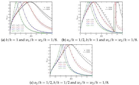 A convergence study for both EEM and BEM was done prior to performing the computations of the results. For the calculations, the water depth is assumed to be 7.90 m, and a wave period T bounded by s, as in [35]. In the case of the EEM, see Table 1, a convergence analysis for the maximum hydrodynamic efficiency is given for different values of the non-dimensional frequency . From Table 1, it can be seen that roughly 30 evanescent modes are adequate to ensure that the analytical results converge to within three decimal places. However, it should be noted that the OWC geometry is relevant for the convergence, and the number of equations needed in the matched EEM, especially for the lower corners of the walls, since as “” and “” decrease, more terms are needed. For the case without the step, the results converge faster, to the desired accuracy even with 20 terms in the infinite series sums. However, on average, 30 terms are sufficient for the desired accuracy; therefore, in the present calculations, is used.