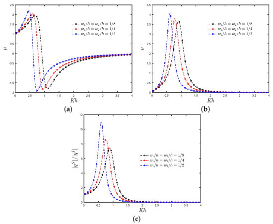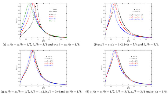 The results of the hydrodynamic efficiency versus for various thickness ratios are shown in Figure 11b. It is observed that an increase in the thickness of the walls leads to both reduction of the bandwidth of the efficiency curves and the peak frequency value. Furthermore, it is seen that when and increase, the medium-height peak slightly increases, while the zero efficiency value is shifted to lower frequencies.