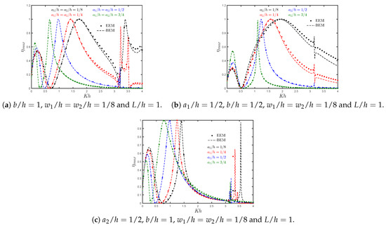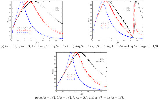 The analytical and numerical results of the hydrodynamic efficiency versus for an OWC device in the presence of a reflection wall with different chamber length to water depth ratios are shown in Figure 11a. Compared to Figure 5a, it is observed that the efficiency bandwidth is reduced when a reflecting wall is considered. In this case, it is observed that due to the near trapped waves in the gap between the OWC chamber and the rigid vertical wall, a medium-height peak at low frequencies appears in the efficiency curves. This peak increases as the chamber length to water depth ratio increases. Furthermore, a zero efficiency value appears at 0.450.61 that reduces the possibility of wave energy extraction at large periods.