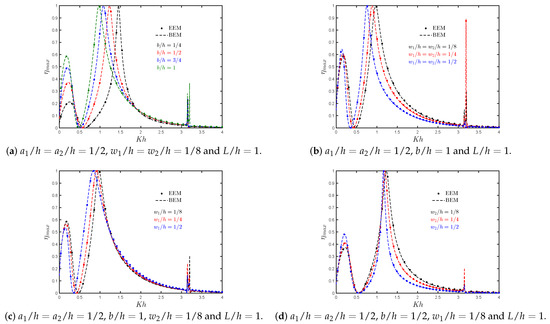 The analytical results for the radiation susceptance and radiation conductance coefficients, and , respectively, and the non-dimensional induced volume flux due to the scattering potential versus the non-dimensional frequency for different values of are shown in Figure 14a–c. Figure 14a shows a decrease in the negative values of when the gap between the rear and reflecting walls also decreases. As in [10], in Figure 14a,b it is observed that at resonance, the total variation from positive to negative in the radiation susceptance coefficient is related to the peak values of the radiation conductance. Finally, from Figure 14b,c it is observed that the peak in and , respectively, at the fundamental resonance increase when decrease.