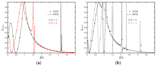 The results of the hydrodynamic efficiency versus the non-dimensional frequency for different lengths of the gap between the rear and reflecting walls are shown in Figure 13a,b. In these two figures, it is observed that the bandwidth of the efficiency increases, while the medium-height peak at low frequencies reduces when the distance of separation between the fixed OWC and the reflecting wall increases. It is also observed that at and 4, the shape of the curve tend to that observed in Figure 5a for , although a peaky trend is observed for . All these aspects should be considered at the design stage since the near trapped waves generated between the reflecting wall and the OWC device can reduce the efficiency bandwidth of a fixed-detached OWC device at high periods.
