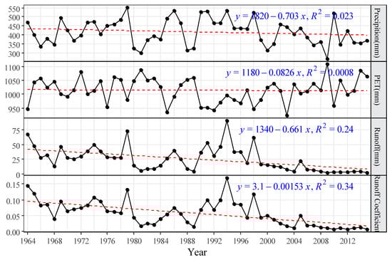 Time series of annual precipitation, PET (potential evapotranspiration), runoff, and runoff coefficient from 1964 to 2015 in the Laohahe basin.