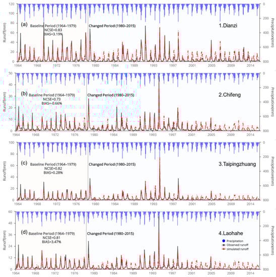 Monthly observed and simulated runoff (by VIC model) from 1964 to 2015 over the four selected basins: (a) Dianzi, (b) Chifeng, (c) Taipingzhuang, (d) Laohahe.