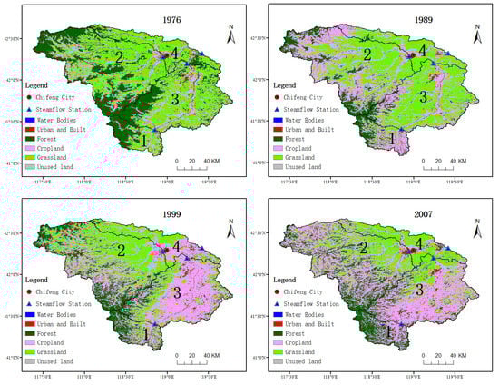 Since the 1960s, the dramatic change of runoff in the Laohahe basin is influenced by climatic variability and human intervention. The main modes of production in the Laohahe basin are agriculture and animal husbandry. Land use and land cover change (LUCC) is mainly influenced by the policies issued by the national and regional governments. All these human interventions significantly altered LUCC and further affected the hydrological processes. Then we analyzed the conversion of LUCC based on four periods of remote sensing data from 1976, 1989, 1999, and 2006 (Figure 5). The results show that since 1976, forest, grassland, and cropland have been the mainland-use types in the Laohahe basin. In the Laohahe basin, the scale and range of land type transfer were large. Grassland area decreased year by year (41.91%, −38.24%, −28.3%, −22.43%), while forest area decreased first and then increased (33.78%, −19.4%, −31.34%, −32.04%). The total area of cropland showed an increasing trend (21.05%, −38.76%, −37.23%, −41.75%).