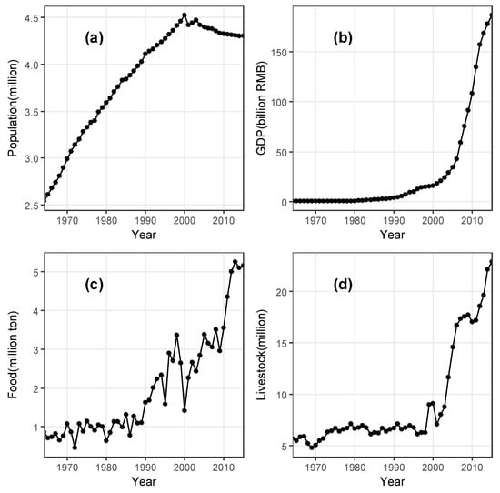 Changes in GDP, population, food, and livestock in Chifeng City for 1964–2015, (a) population; (b) GDP; (c) Food; (d) Livestock.