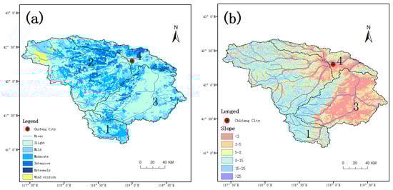 Distribution of soil erosion intensity and slope zone in Laohahe basin, (a) soil erosion intensity; (b) slope zone.