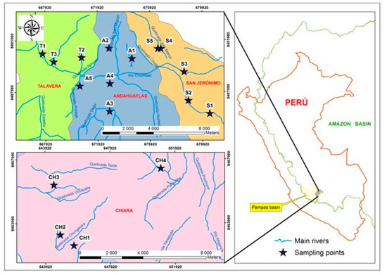 Water sources (springs) were identified, which supply to the urban and rural areas of the districts of Andahuaylas, San Jerónimo, Talavera, and Chiara. Their coordinates are shown in Table 1, and permission for sampling was requested from representatives of JASS.