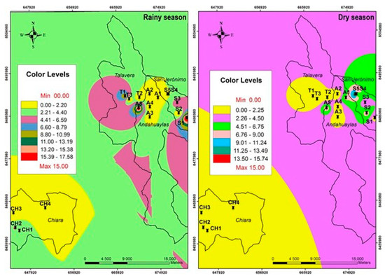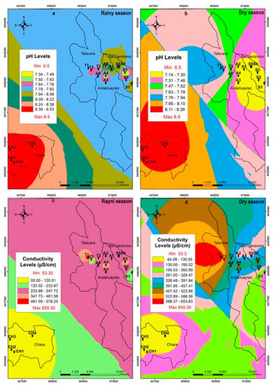 The pH of water in the rainy season had a maximum of 8.53 and a minimum of 7.33 (p < 0.05), while in the dry season, a maximum of 8.32 and a minimum of 6.71 (p < 0.05) were reported (Table 4). There was no significant difference in both seasons (p = 0.973). On the other hand, in the Chiara area (CH), pH values were higher than 8.0 in both seasons (Figure 4a,b). This could be influenced by metallurgical mining extraction at the head of the basin, where rocks have high carbonate content, as evidenced by the high hardness values (Table 4). In the springs of the districts of Andahuaylas, San Jerónimo, and Talavera, the pH levels are within the limits established by the WHO [14] and ECA-Peru [18].