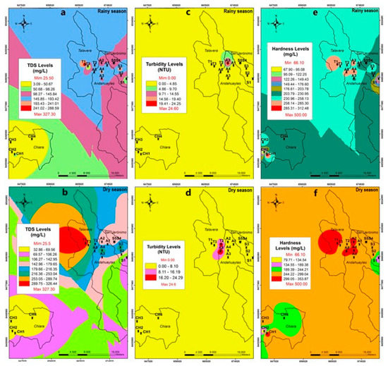 (a) TDS in rainy season, (b) TDS in dry season, (c) turbidity in rainy season, (d) turbidity in dry season (e), hardness in rainy season, and (f) hardness in dry season, in the sampling areas.