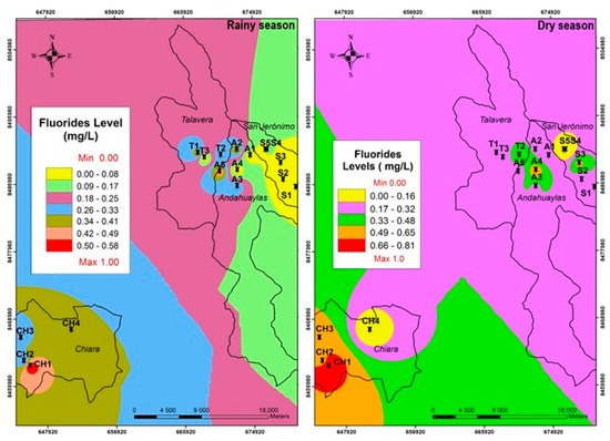 Regarding the fluorides level, it was observed that it is in the range from 0.00 to 0.81 mg/L in the dry season (p < 0.05), and from 0.02 to 0.58 mg/L in the rainy season (p < 0.05), and it shows no significant differences between seasons (p = 0.081) (Table 4). The levels found do not exceed the limits established by the WHO [16] and ECA-Peru [16], and it was observed that fluoride levels increase in the dry season (Figure 6) due to evaporation, while the opposite happens in the rainy season, due to dilution. A similar behavior was reported by Amenu et al. [1] and Davraz et al. [38].