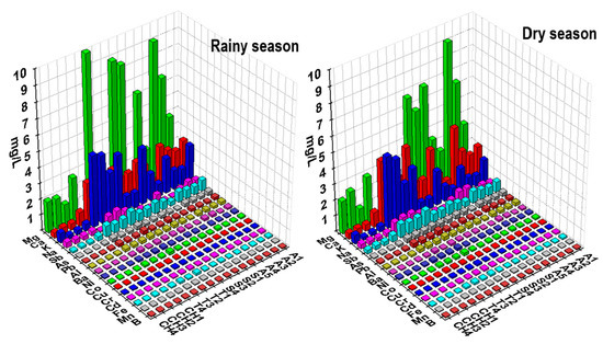 In the same way, the level of dissolved oxygen (DO) was found in the range from 2.54 to 7.03 mg/L in the dry season, and from 2.05 to 7.37 mg/L in the rainy season, with no significant differences between seasons (p = 0.291) (Table 4). Although this parameter is not considered critical in terms of water quality for human consumption [16,18], low DO values would be an indicator of contamination due to leachate and runoff in groundwater [35,37], and in natural waters these should be above 5.0 mg/L.
