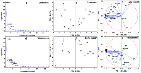(a) Scree plot for the dry season, (b) scores plot for PC1 and PC2 in the dry season, (c) loadings plot for PC1 and PC2 in the dry season, (d) scree plot for the rainy season, (e) scores plot for PC1 and PC2 in the rainy season, and (f) loadings plot for PC1 and PC2 in the rainy season.