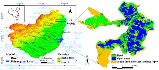 Baiyangdian Lake (38°43′–39°02′ N, 115°38′–116°07′ E), being the largest freshwater lake in the North China Plain (Figure 1), plays an important role in water resource provisions, flood controls and climate regime regulations []. Historically, nine rivers flowed into Baiyangdian Lake; however, most of these rivers, under the influence of climate change and anthropogenic activity, have dried up. Baiyangdian Lake belongs to a shallow-water lake system type, for which water levels range from 6.5 m to 9.5 m. When water levels fall below 6.5 m, Baiyangdian Lake will dry up, while its surrounding wetlands will disappear when the water levels fall below 5.5 m []. Furthermore, 94 km2 of raised fields and greater than 3700 ditches divide the entire water body into 140 small shallow lakes. Due to its unique wetland topography and vegetation composition (mainly P. australis community), small water level fluctuations typically cause significant alterations in ratio between vegetation cover and open-water area. To alleviate water shortages, ecological water transfer projects have been implemented in the lake since the 1980s to maintain its integrity []. Specifically, the planning outline of the Xiong’an New Area, which has jurisdiction over Baiyangdian Lake, includes an ordinance for its ecological restoration (e.g., natural water level fluctuating around 6.5 m, and water quality meeting China surface water environmental quality class III-IV standard). Inevitably, however, alterations in hydrological regimes will result in changes to Baiyangdian Lake aquatic ecosystems [,,].