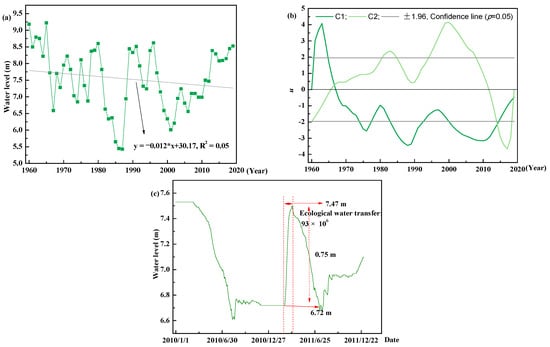 The temporal variation of water level for Baiyangdian wetland. (a) temporal trend for water level; (b) abrupt changes for water level detected by the Mann-Kendall method; and (c) a water level fluctuation example caused by the ecological water transfer from December 2010 to March 2011. The u represents statistics variables in the Mann-Kendall method, C1 and C2 is statistical variables calculated from normal and invert series. The intersection point of C1 and C2 located between the confidence lines (±1.96 at 95% confidence line) is the time of the abrupt changes [,].