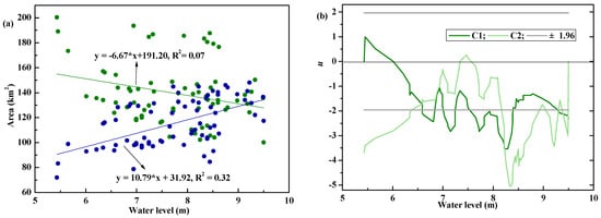 The variation of P. australis cover and open water area with water level fluctuations. (a) P. australis cover (showed as ●) and open water area (presented as ●) varied with water level fluctuations; (b) the abrupt changes detected by Mann-Kendall method for P. australis cover.