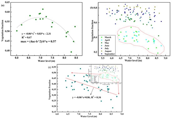 As seen in Figure 4, Fv values are controlled by water levels. The Fv increased, reaching a peak at a water level around 6.95 m, and then decreased along with water level increasing. According to the fitted model, the maximum Fv value (0.57) was deduced, and suitable water levels for vegetation ranged from 6.94 to 6.97 m. At a monthly scale, the linear relationship between Fv values and water levels were good in March and April, namely, the initial growing stage. And Fv decreased with an increase in water levels with a slope of −0.06 (R2 = 0.34).