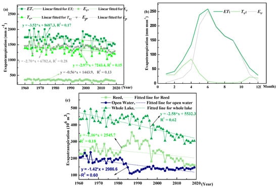 Variation in annual (a) and monthly (b) evapotranspiration (ET) and potential evaporation (Ev), potential evaporation (Ev), potential transpiration (Tv) and potential evaporation (Ep) in Baiyangdian Lake. Annual evapotranspiration (ET) for reed, open water, and whole lake showed (c). This figure also provides linear fitted slopes for ET, Ev, Tv and Ep and for ET for the entire lake and open-water area and P. australis cover.